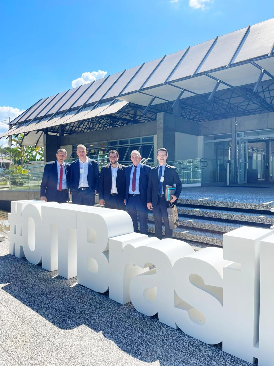 Legenda: Gilmar Sossella (secretário do Trabalho e Desenvolvimento Profissional do RS), Felipe Bremm (consultor da Cooperativa Vinícola Aurora), Maurício Bonafé (gerente Agrícola da Aurora), Renê Tonello (presidente da Aurora) e Ricardo Barbosa (diretor-geral da Sec. do Trabalho e Desenvolvimento Profissional do RS) em frente à sede da OIT Brasil, em Brasília.